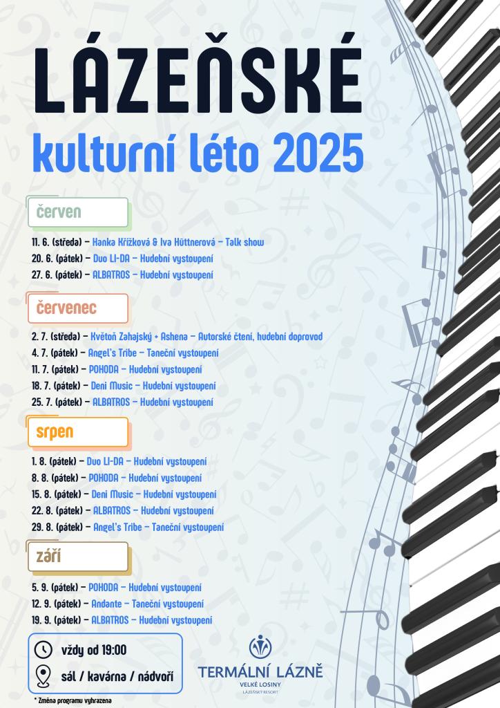 Přijďte si užít kulturní léto v Termálních lázních Velké Losiny. Čekají vás vystoupení hudebních a tanečních umělců každý pátek od června do září.