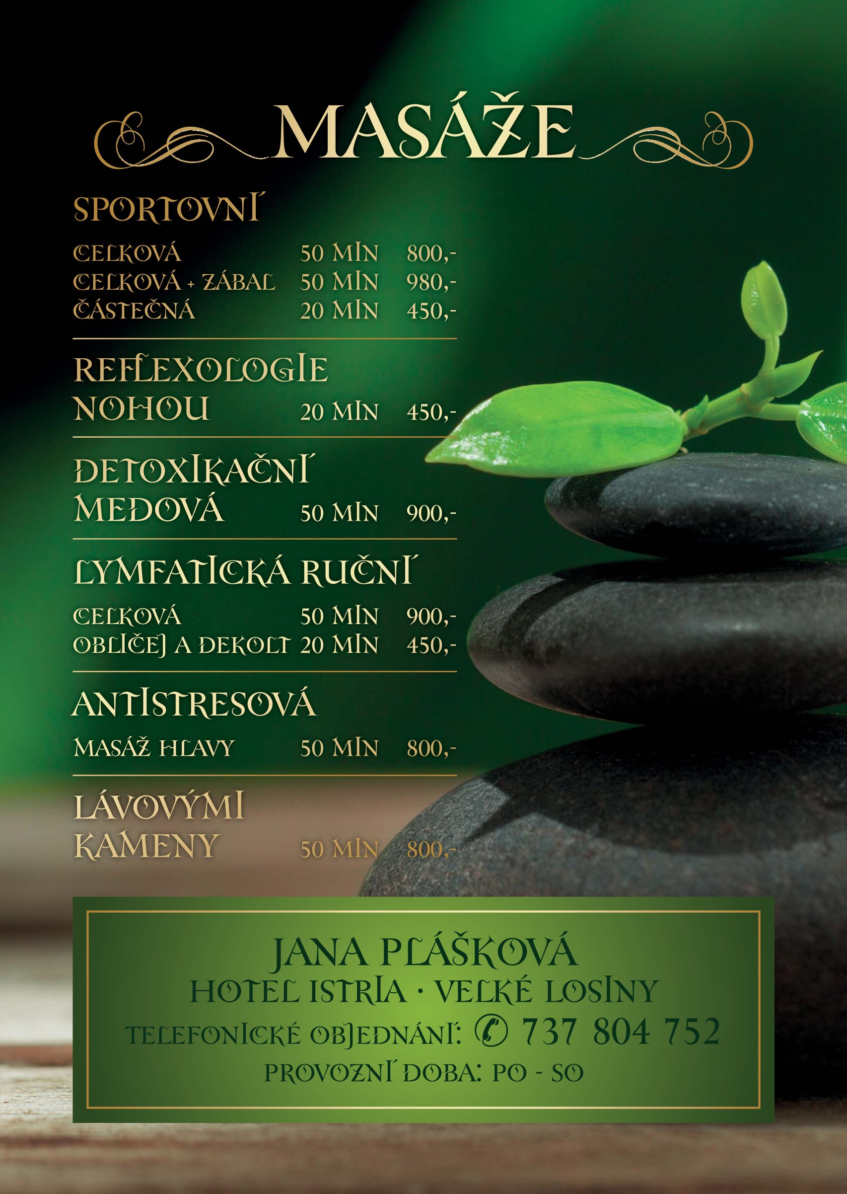 Nově v hotelu Istria nabízíme možnost relaxačních masáží, které poskytuje certifikovaná masérka Jana Plášková.